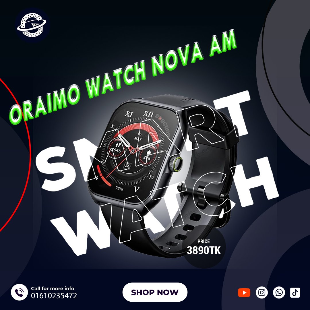 The Oraimo Watch Nova AM (model OSW-812) is a premium entry into Oraimo’s “Nova” series, distinguished by its large, curved AMOLED display and exceptional battery efficiency. It is designed for those who prefer a square-faced aesthetic with high-end visual clarity and robust communication features.